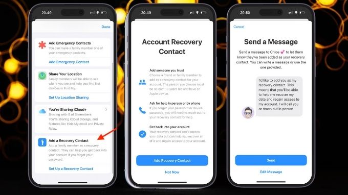 Để thiết lập, mở ứng dụng Cài đặt, chọn tên của người dùng ở trên cùng, sau đó chọn Password & Security (Mật khẩu & Bảo mật) > Account Recovery (Khôi phục tài khoản) > Add Recovery Contact (Thêm liên hệ khôi phục). Người dùng sẽ cần xác nhận danh bạ thông qua xác thực hai yếu tố. Đây là một biện pháp an toàn thông minh mà bất kỳ người sử dụng iPhone nào cũng nên thực hiện.