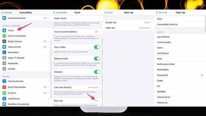 Tính năng này được ẩn sâu trong cài đặt: Vào Cài đặt > Trợ năng > Cảm ứng > Chạm vào mặt sau. Tại đây, người dùng chọn chạm hai lần hoặc ba lần, sau đó chọn hành động mong muốn như mở camera, bật đèn pin hay cuộn trang.