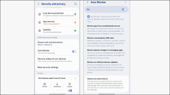 Auto Blocker là một tính năng bảo mật được trang bị trên các dòng máy Samsung mới, chẳng hạn như Galaxy S23 Ultra. Khi kích hoạt, tính năng này sẽ chặn các hành vi cài đặt ứng dụng không rõ nguồn gốc, ngăn ngừa nguy cơ cài nhầm phần mềm độc hại.