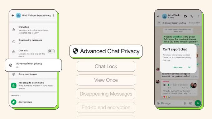 WhatsApp, Messenger hay Zalo là các ví dụ phổ biến, hỗ trợ mã hóa đầu cuối mặc định cho tất cả cuộc trò chuyện. Trên Whatsapp bạn có thể bật tính năng Advanced Chat Privacy để nâng cao bảo mật hơn: ứng dụng sẽ ngừng tự động tải phương tiện, chặn xuất nội dung trò chuyện và không dùng các đoạn chat đó cho tính năng AI.