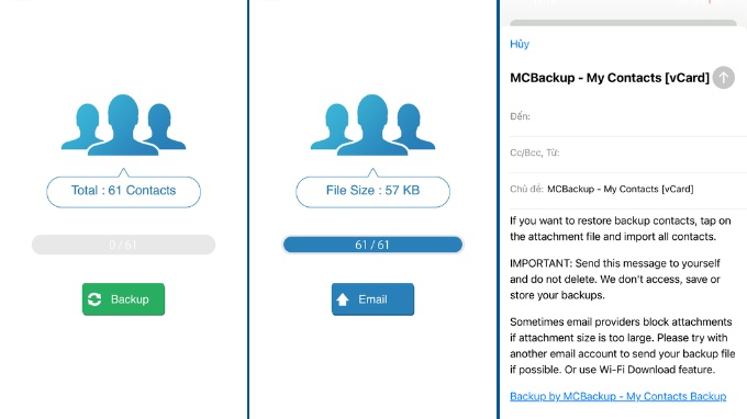 Bước 1: Tải My Contacts Backup từ App Store > Mở ứng dụng, cấp quyền truy cập danh bạ và nhấn Sao lưu (Backup). Ứng dụng sẽ tạo tệp VCF chứa toàn bộ liên hệ > Chọn ch và gửi tệp đến địa chỉ email của bạn.