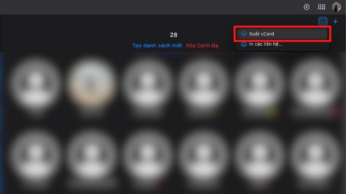 Bước 4: Tìm chọn biểu tượng chia sẻ > Nhấn Xuất vCard để tải tệp VCF chứa toàn bộ danh bạ về thiết bị.