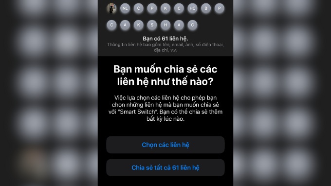 Bước 3: Trên iPhone, nhấn Chọn các liên hệ hoặc Chia sẻ tất cả liên hệ tùy theo nhu cầu > Sau đó nhấn Chuyển và chờ quá trình hoàn tất.
