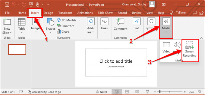 Bước 2: Trong giao diện PowerPoint, chọn tab Insert trên thanh công cụ > Sau đó nhấn vào Screen Recording. Một thanh công cụ mới sẽ xuất hiện để bạn tùy chỉnh khu vực quay.