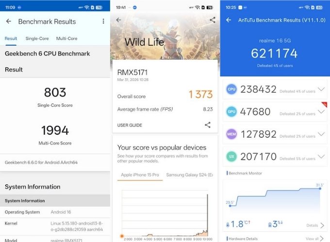 Dù vậy, hiệu năng không phải là thế mạnh của sản phẩm khi so với các đối thủ trong cùng tầm giá. Với những người dùng đặt nặng yêu cầu về chơi game hoặc xử lý tác vụ nặng, realme 16 5G có thể chưa đáp ứng tốt kỳ vọng. Ngược lại, nếu ưu tiên sự ổn định lâu dài, pin bền và trải nghiệm sử dụng cân bằng, đây vẫn là lựa chọn đáng cân nhắc.