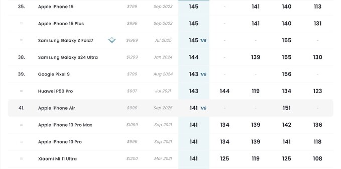 Kết quả cho thấy iPhone Air chỉ đạt 141 điểm trong bảng xếp hạng camera của DxOMark, đứng vị trí 41 và xếp sau Google Pixel 8, iPhone 15 cùng Xiaomi 15. Hạn chế lớn nhất đến từ việc thiếu camera chuyên dụng, khiến zoom kỹ thuật số và chế độ panorama không thể bù đắp cho camera góc siêu rộng hoặc tele thực sự, dẫn đến việc thiết bị bị trừ điểm đáng kể ở các bài kiểm tra zoom và chụp góc rộng.