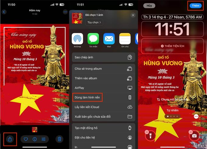 Bước 3: Nhấn vào biểu tượng Chia sẻ (hình ô vuông có mũi tên lên) > Chọn Dùng làm hình nền > Điều chỉnh vị trí nếu cần > Nhấn Thêm và chọn vị trí mong muốn.