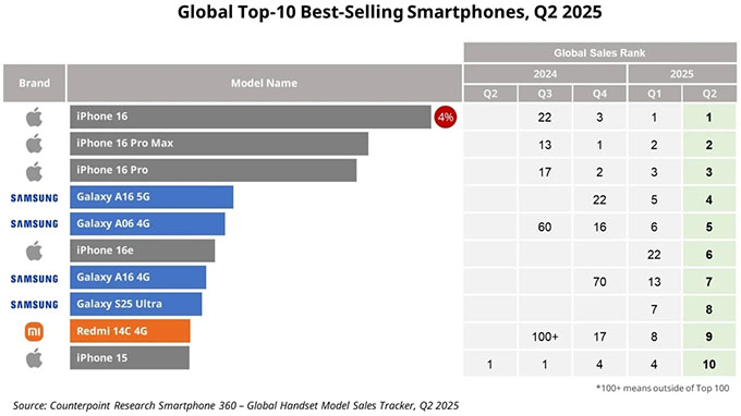 Năm 2025 tiếp tục chứng kiến Apple giữ vững ngôi vị nhà cung cấp smartphone hàng đầu thế giới, vượt Samsung với khoảng cách khoảng 1% thị phần. Con số chênh lệch không lớn, nhưng khi nhìn vào bảng xếp hạng các sản phẩm bán chạy nhất theo quý, lợi thế của Apple so với đối thủ Hàn Quốc trở nên rõ ràng hơn nhiều.