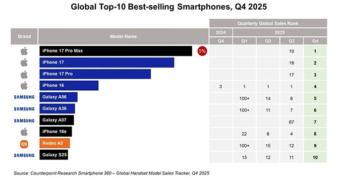 Counterpoint Research - một trong những công ty phân tích thị trường di động uy tín nhất ghi nhận rằng trong quý 4/2025, không dưới năm mẫu iPhone nằm trong top 10 điện thoại bán chạy nhất toàn cầu. Đây là mức độ thống trị mà không thương hiệu Android nào có thể sánh được, dù Samsung hay bất kỳ nhà sản xuất Trung Quốc nào.