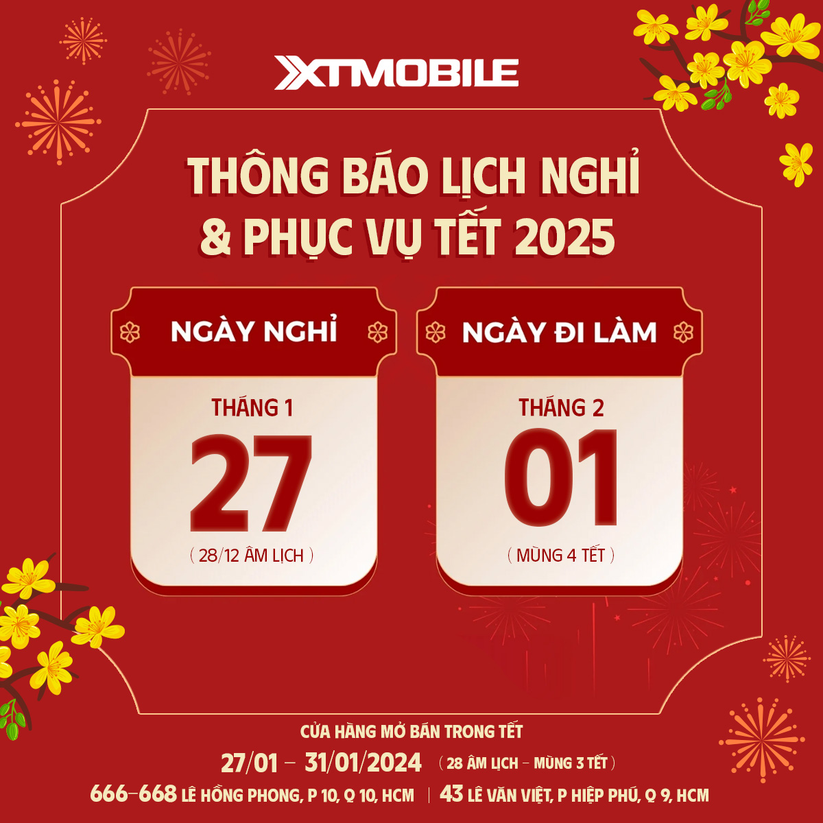 Lịch nghỉ chung: Hệ thống cửa hàng XTmobile sẽ nghỉ Tết trong 5 ngày từ 27/01/2025 (28 âm lịch) đến hết ngày 31/01/2025 (Mùng 03 Tết).