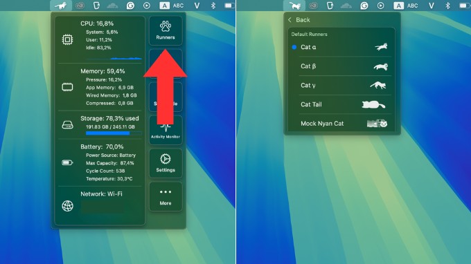 RunCat không chỉ dừng lại ở việc hiển thị một chú mèo chạy vui mắt. Ứng dụng này sở hữu nhiều tính năng hữu ích, giúp người dùng quản lý hiệu suất Mac hiệu quả hơn: