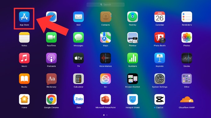 Bước 1: Truy cập App Store từ Dock hoặc tìm kiếm trong Spotlight bằng cách nhấn Command + Space và gõ “App Store”.