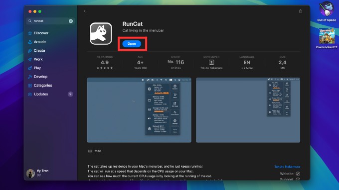 Bước 4: Sau khi tải xong, nhấn “Open” để khởi chạy RunCat. Một chú mèo sẽ ngay lập tức xuất hiện trên thanh menu, sẵn sàng hoạt động.