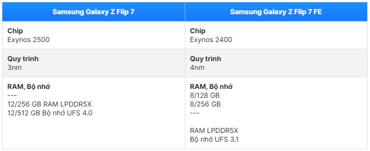 Trong khi đó, phiên bản FE vẫn dùng chip Exynos 2400. Mặc dù vẫn rất mạnh mẽ, nhưng Exynos 2400 sẽ có phần thua thiệt hơn một chút về sức mạnh xử lý đồ họa (GPU) và khả năng xử lý AI (NPU) so với người đàn anh 2500. Bên cạnh đó, Galaxy Flip 7 còn được trang bị RAM 12 GB, trong khi FE chỉ dừng lại ở 8 GB.